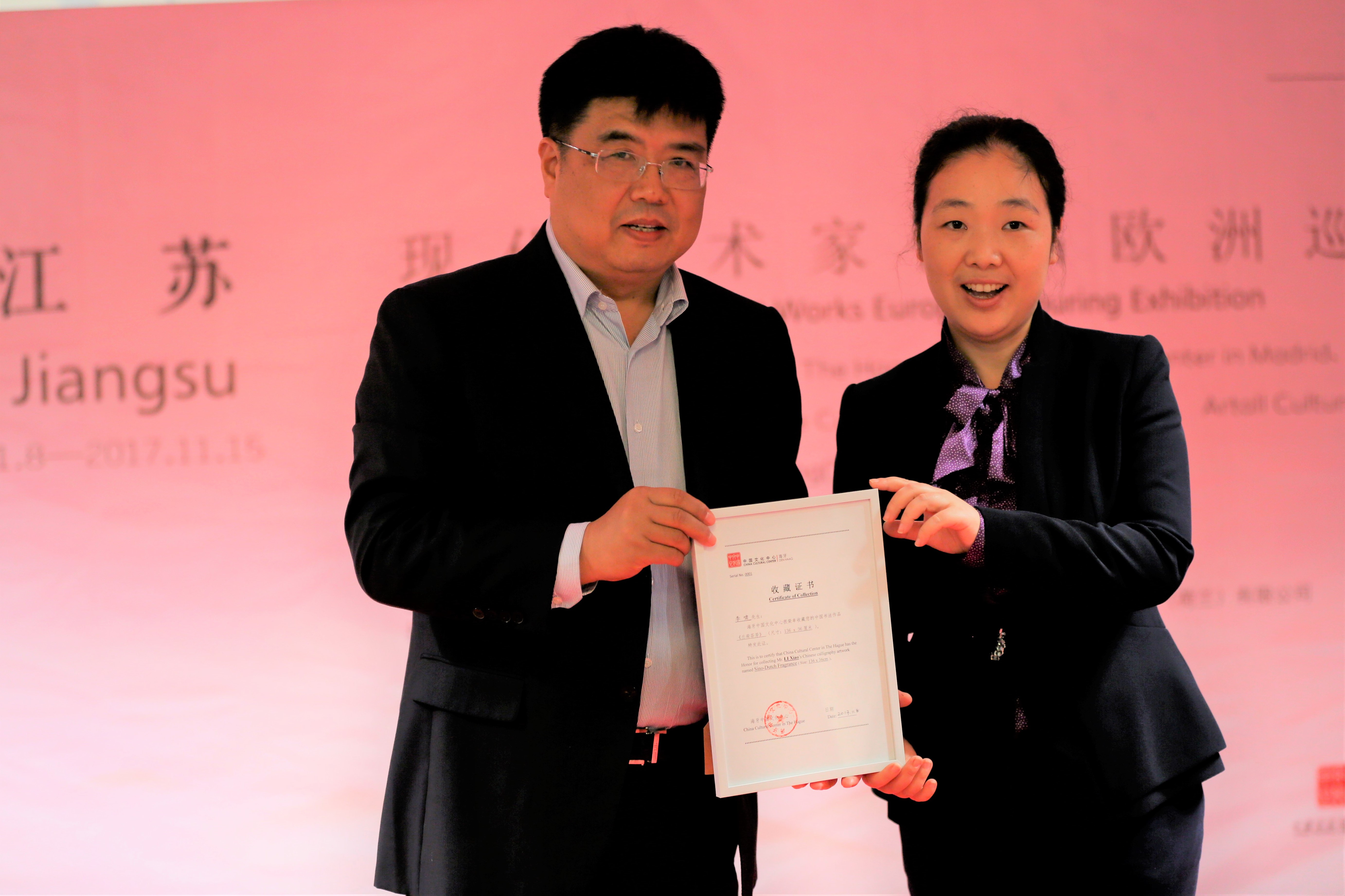 開幕儀式上,江蘇省書法院院長李嘯現場揮毫創(chuàng)作了《蘭荷芬芳》,并將該作品贈送給海牙中國文化中心。海牙中國文化中心主任孫蓓代表海牙中國文化中心接受了捐贈,并向李嘯院長頒發(fā)了《收藏證書》。