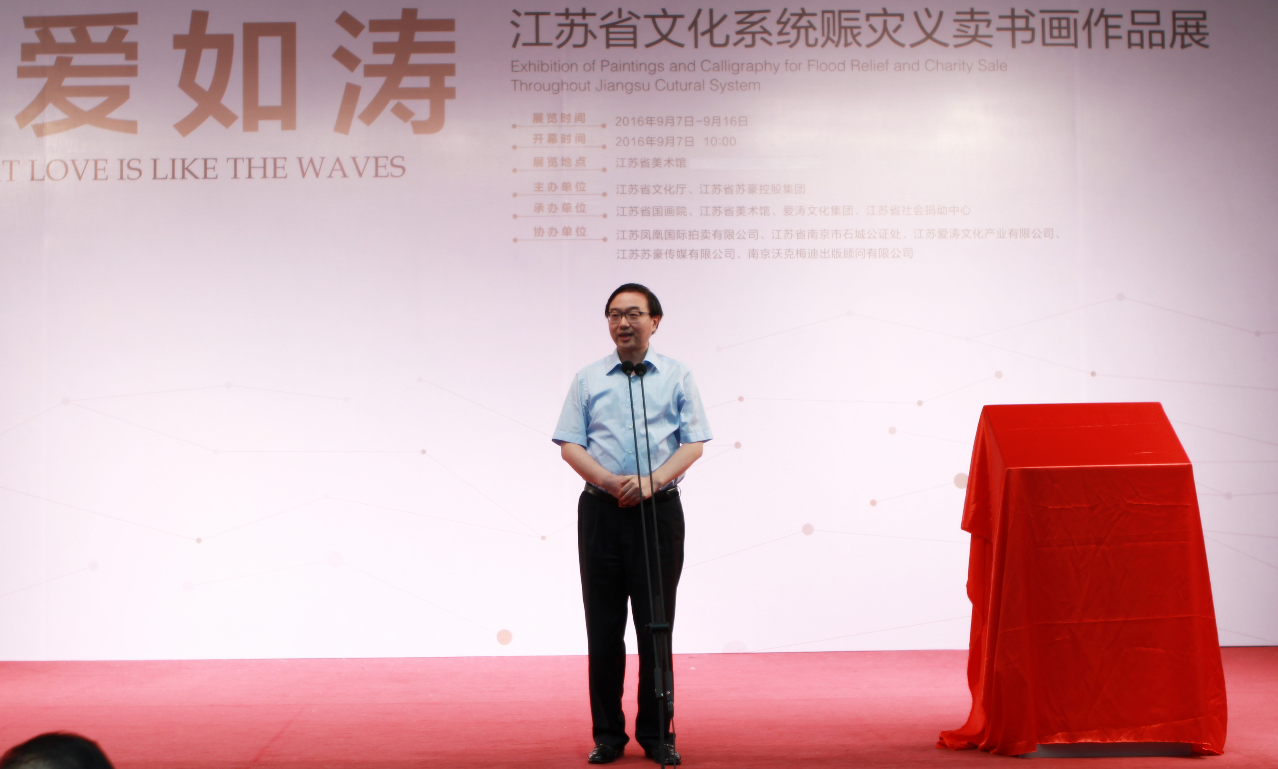 由江蘇省文化廳、江蘇省蘇豪控股集團(tuán)共同主辦,江蘇省國(guó)畫院、江蘇省美術(shù)館、愛濤文化集團(tuán)、江蘇省社會(huì)捐助中心共同承辦的“大愛如濤——江蘇省文化系統(tǒng)賑災(zāi)義賣書畫作品展”,于9月7日在江蘇省美術(shù)館正式開幕,為期10天。并同步出版發(fā)行由蘇豪控股集團(tuán)董事長(zhǎng)王正喜主編的《大愛如濤——江蘇省文化系統(tǒng)賑災(zāi)義賣書畫作品集》。